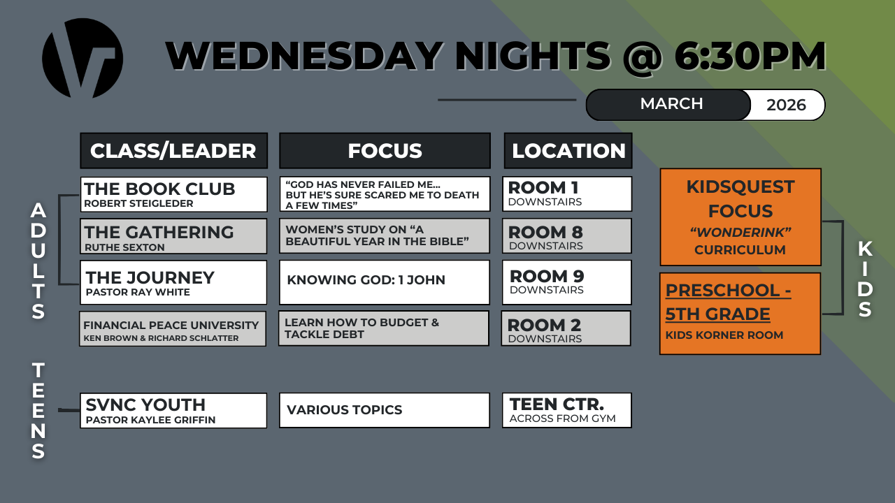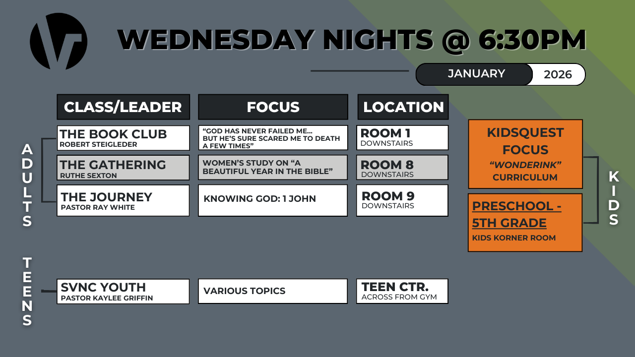 Please note: Wednesday night activities vary during holiday times and in the summer. For the most up-to-date information, reference the weekly bulletin or calendar below.