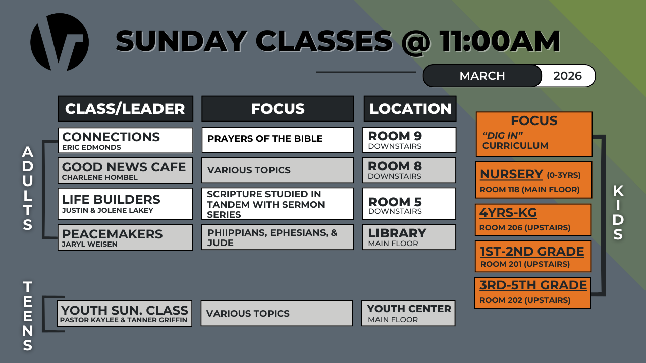 Please note: Sunday class schedules vary from time to time. For the most up-to-date information, reference the weekly bulletin or calendar below.